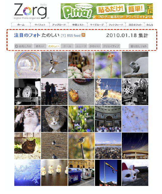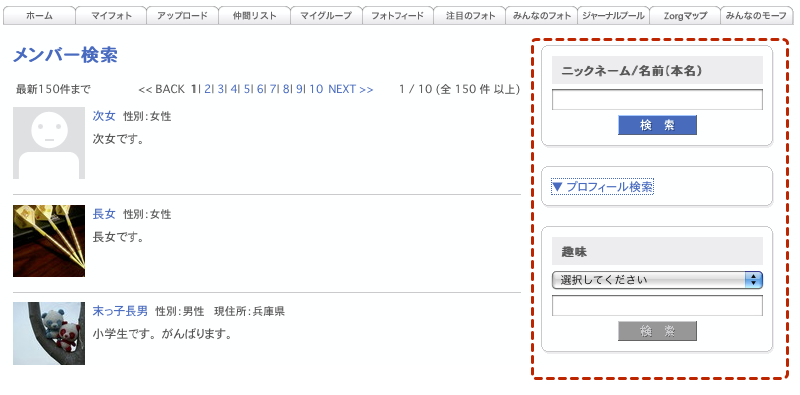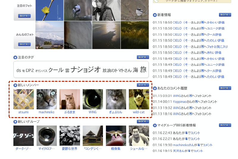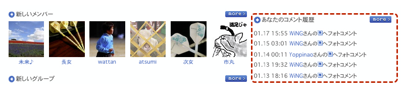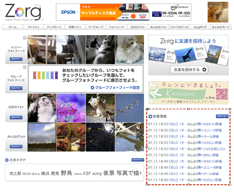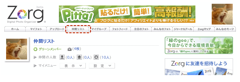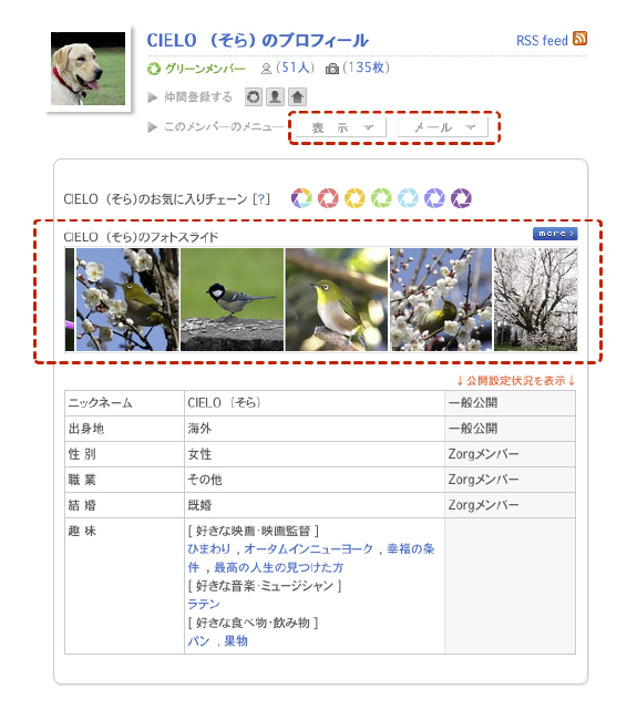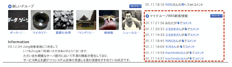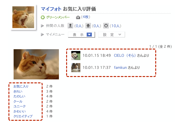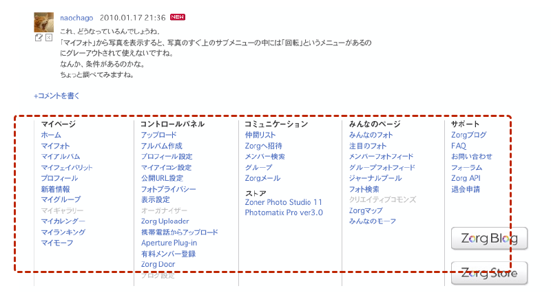 訪問してくれたメンバーを確認する・ソネフォトの「履歴/アクセス」の部分ですね。よく「あしあと」と呼ばれる機能。これがですね・・・Zorg にはありません。閲覧だけでは履歴が残らないのです。なので、コメントを残したり写真をお気に入り評価したりしてくれなければ、自分のページに遊びにきて写真をみていってくれたことはわかりません。ちょっと残念ですね。 |