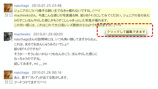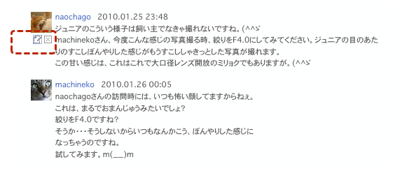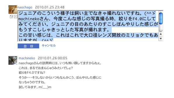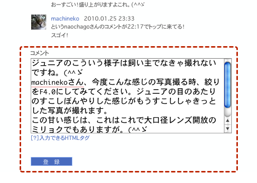 コメントの中にリンクを張る・ソネフォトでは、誰かの写真のページなどのURLをブラウザからコメント欄に直接コピー&ペーストすると、自動的にリンクが張られましたが、Zorg では自動的にはリンクを張ってくれません。簡単なHTMLタグを手動で設定する必要があります。 ソネフォトユーザーのためのZorgガイドのページはこっちです〜 このように記入すると、実際には ソネフォトユーザーのためのZorgガイドのページはこっちです〜 このように表示されます。 ソネフォトユーザーのためのZorgガイドのページはこっちです〜 こう表示。 ソネフォトユーザーのためのZorgガイドのページはこっちです〜 一見難しそうに見えますが、一度やってみると簡単ですので試してみてください。 |